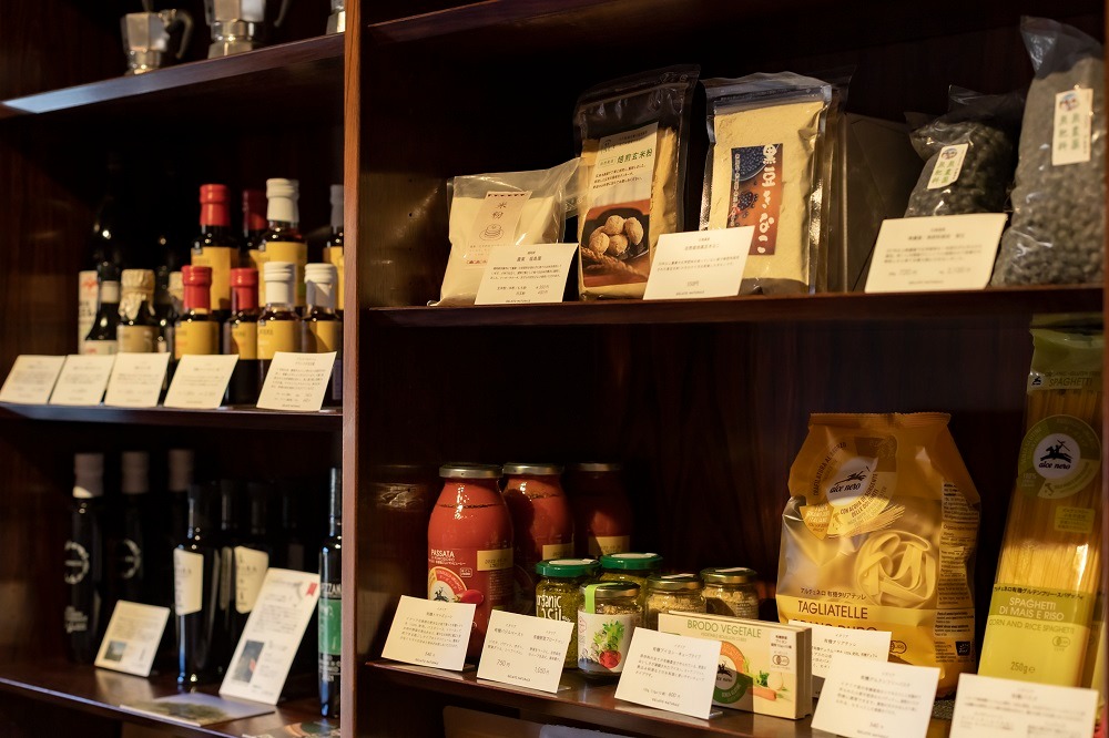 熊本の自然放牧の牧場の牛乳、青森の無農薬・無化学肥料のリンゴ、鹿児島の無農薬・無化学肥料の純黒糖…。北海道から沖縄まで日本各地、そして海外からどのように作られた素材を仕入れているのかが一目でわかり、素材へのこだわりが伝わってきます。「国内の生産者は現地に足を運び、どのように生産されているのかを見て、話を聞いたうえで素材を使用しています。2021年は無農薬でピーチパインを生産する西表島の農家さんを訪れました」と浦本さん。現在も店の一角でジェラートに使用する素材などの販売を行っていますが、将来的にはBIOショップを開きたいという構想もあるのだそうです。