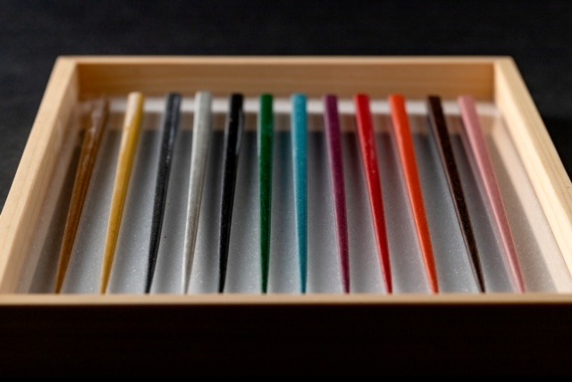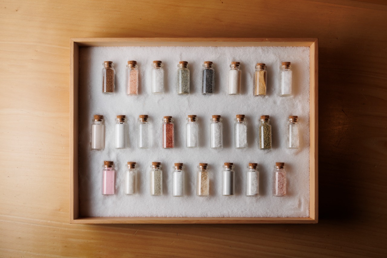 そして、この店ならではの特別な演出も訪れる人々を惹きつける理由です。まずは箸を選ぶことからスタート。高級ブランドや星付きレストランで使われている香川県「Bo Project」の箸が12色用意されています。食事に使った後は持ち帰り用に箱に入れてもらうことができ、すでに全色をコンプリートした常連もいるのだとか。また鶏料理を味わうための塩は、ずらりと並ぶ25種から好きな5種を選ぶことができます。日本のみならず世界各国から集められた塩は多種多様。生産地に想いを馳せ、味を想像しながら塩を選ぶことも楽しそうです。