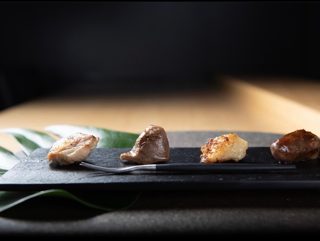 「SHIBU nishinakasu」のメニューは「本日のコース」のみ。トリュフやアミューズ、前菜に始まり、魚料理や肉料理、スープなど、ひと通りのフランス料理に続いて鶏料理が提供されます。福岡が誇る銘柄鶏「はかた地どり」や「はかた一番どり」の朝引きを、最高級と名高い土佐備長炭で焼き上げた鶏料理。串に刺した“ブロシェット”4種、ひと口サイズの焼鳥“ブッセ”9種で、鶏一羽のほとんどの部位を味わうことができます。