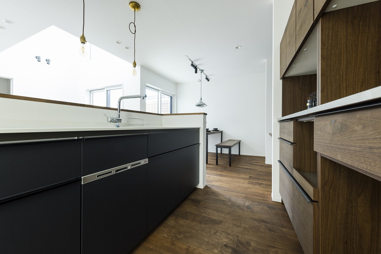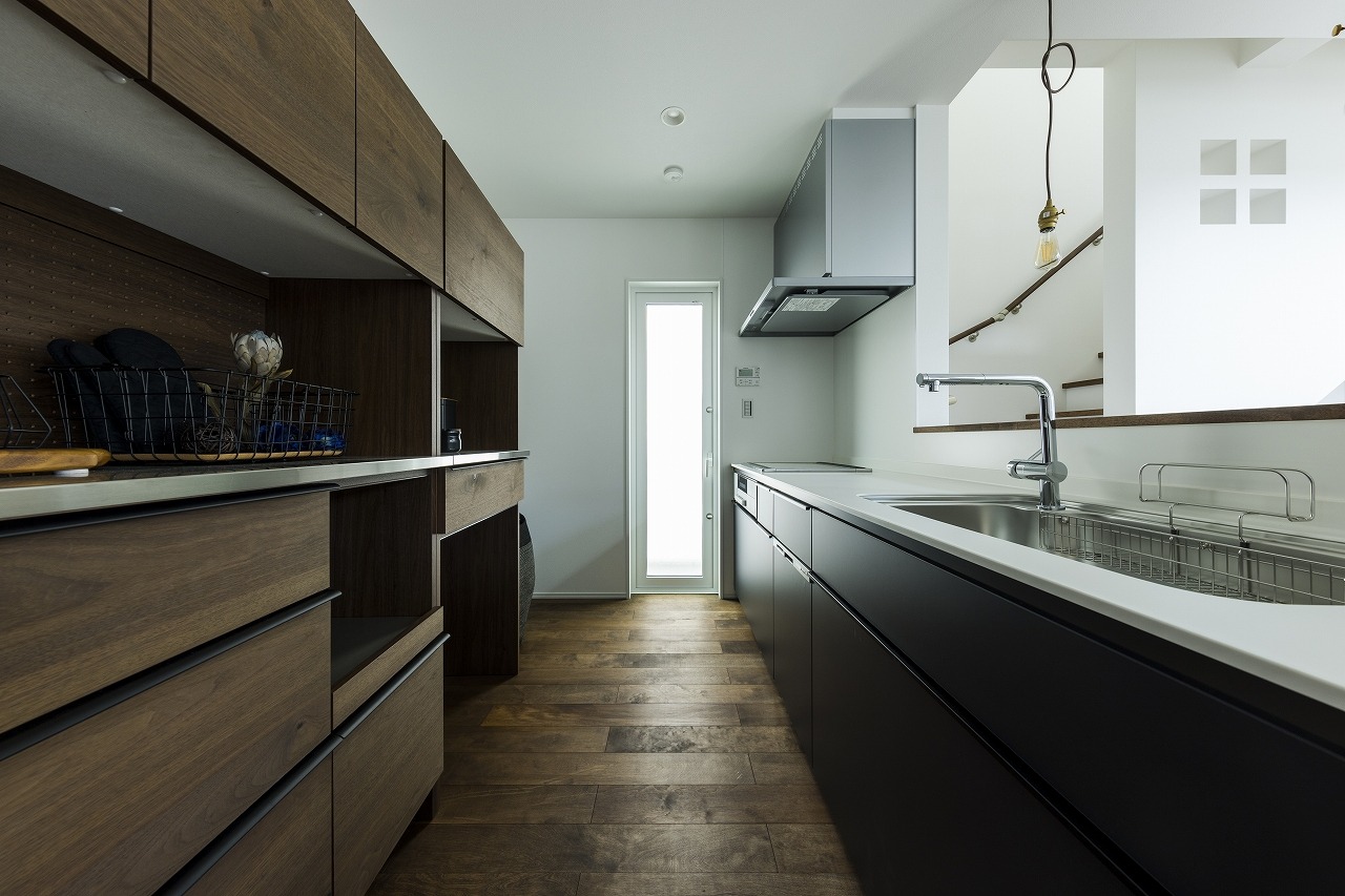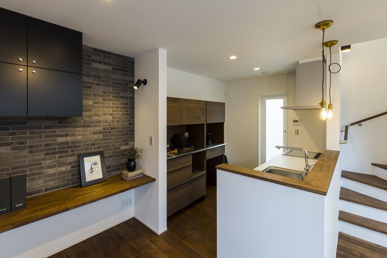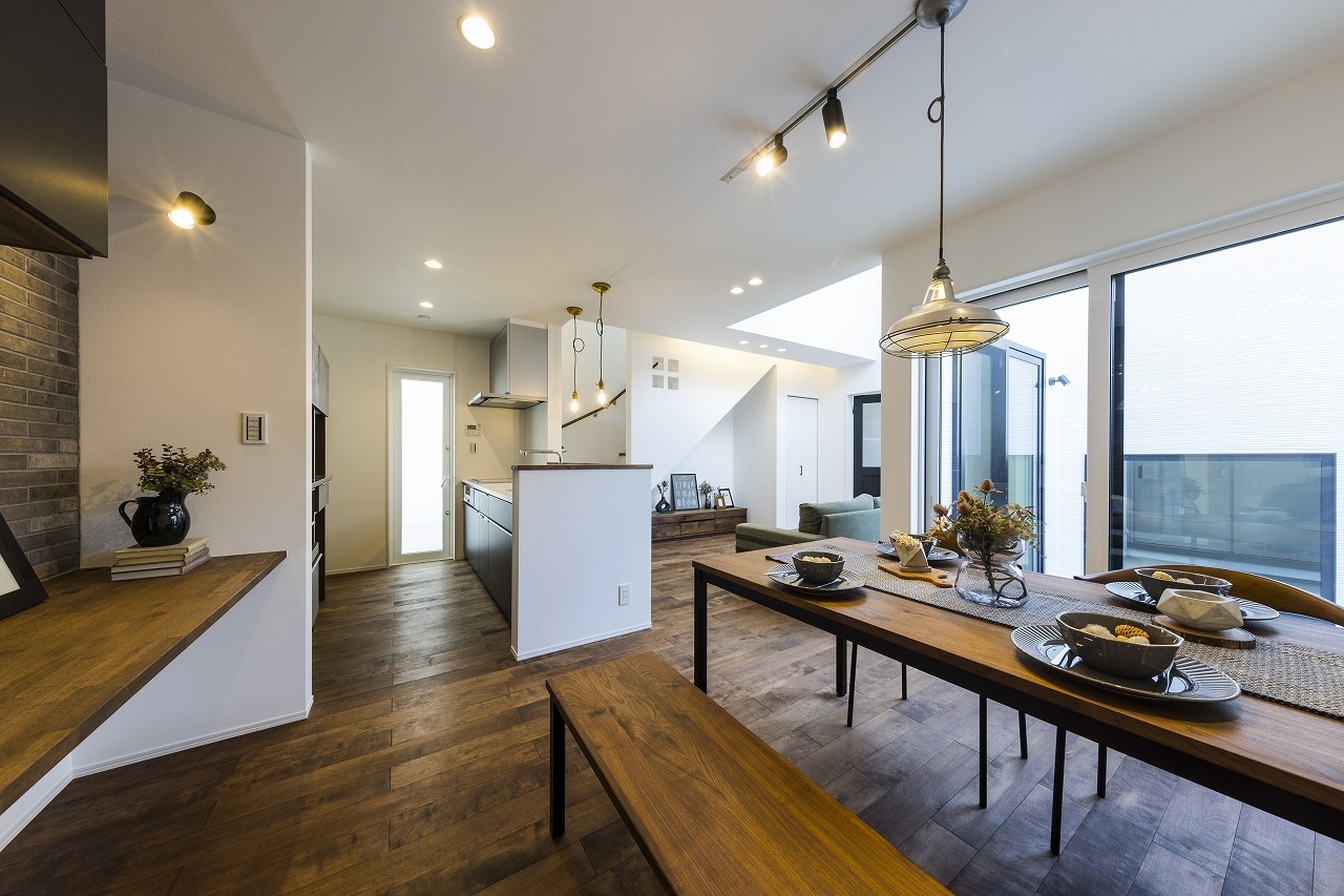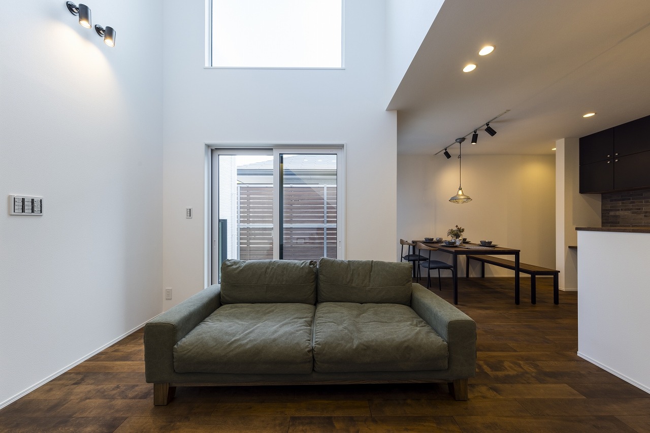 LDKは開放的な吹抜けがあり、4つの窓がアクセントとなったオシャレな空間。キッチンから見える中庭は道路からの目線がシャットアウトされているので、外を見ながら楽しく料理できます。キッチンから洗面、廊下から洗面と家事動線にもこだわっています。洗面には収納を確保し、タオルや下着などを収納可能。また2階寝室にはテレワークスペースとしても使える書斎があります。