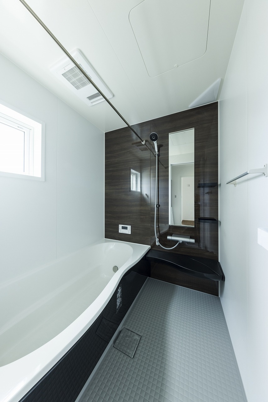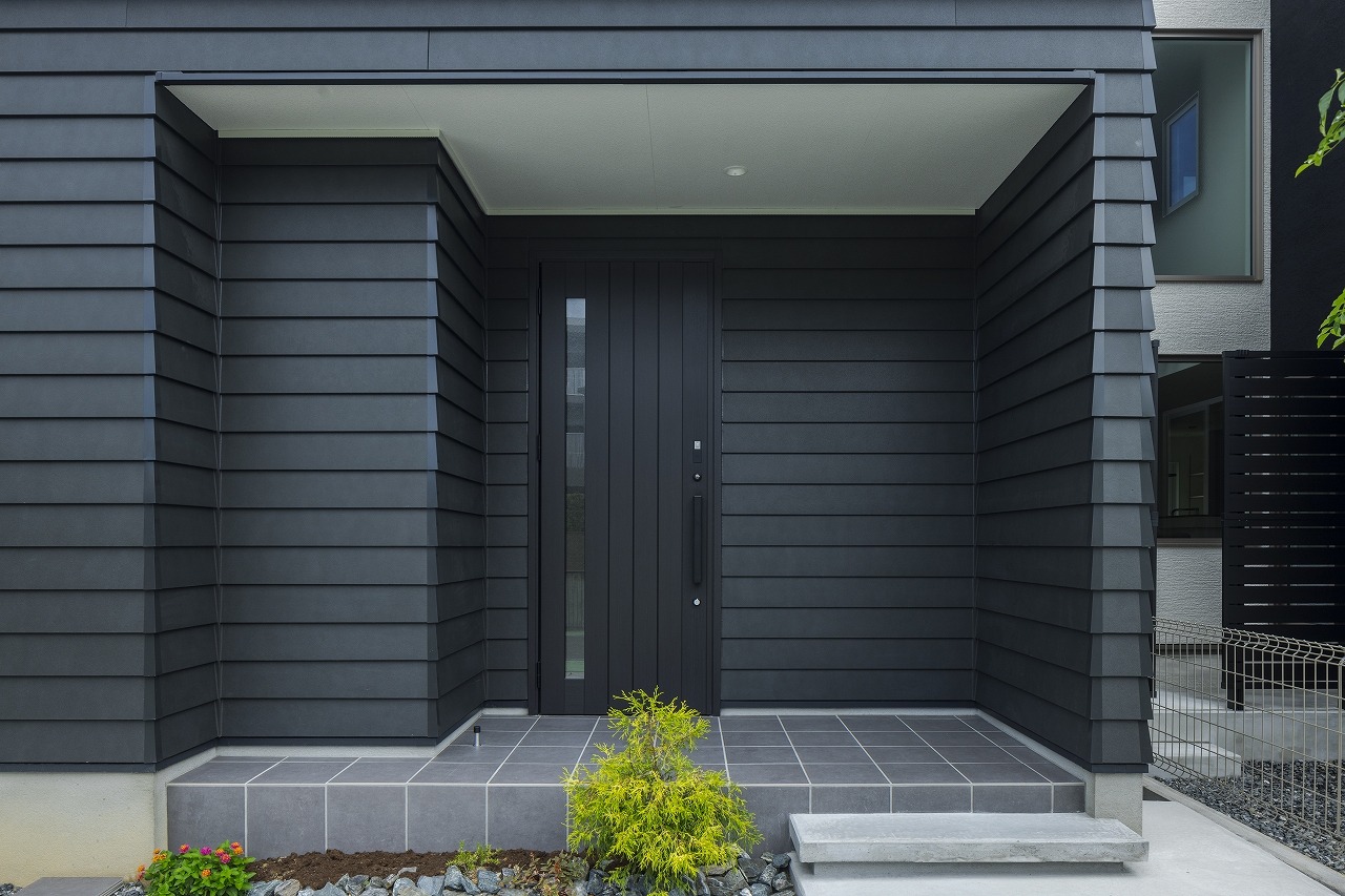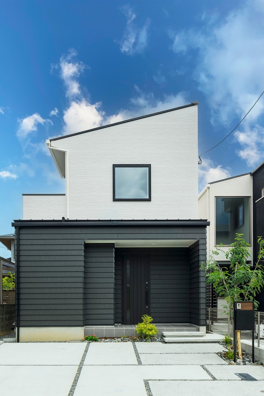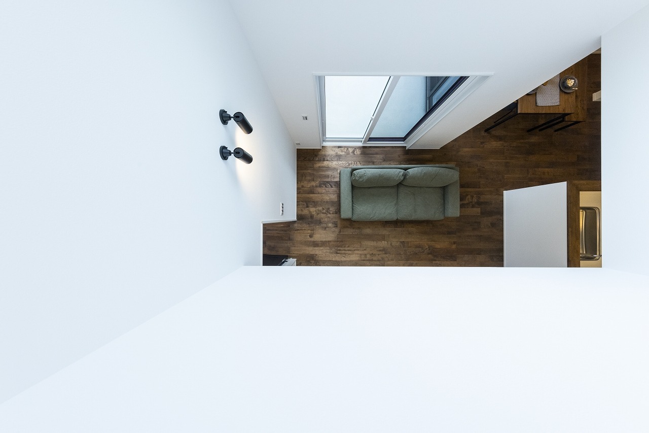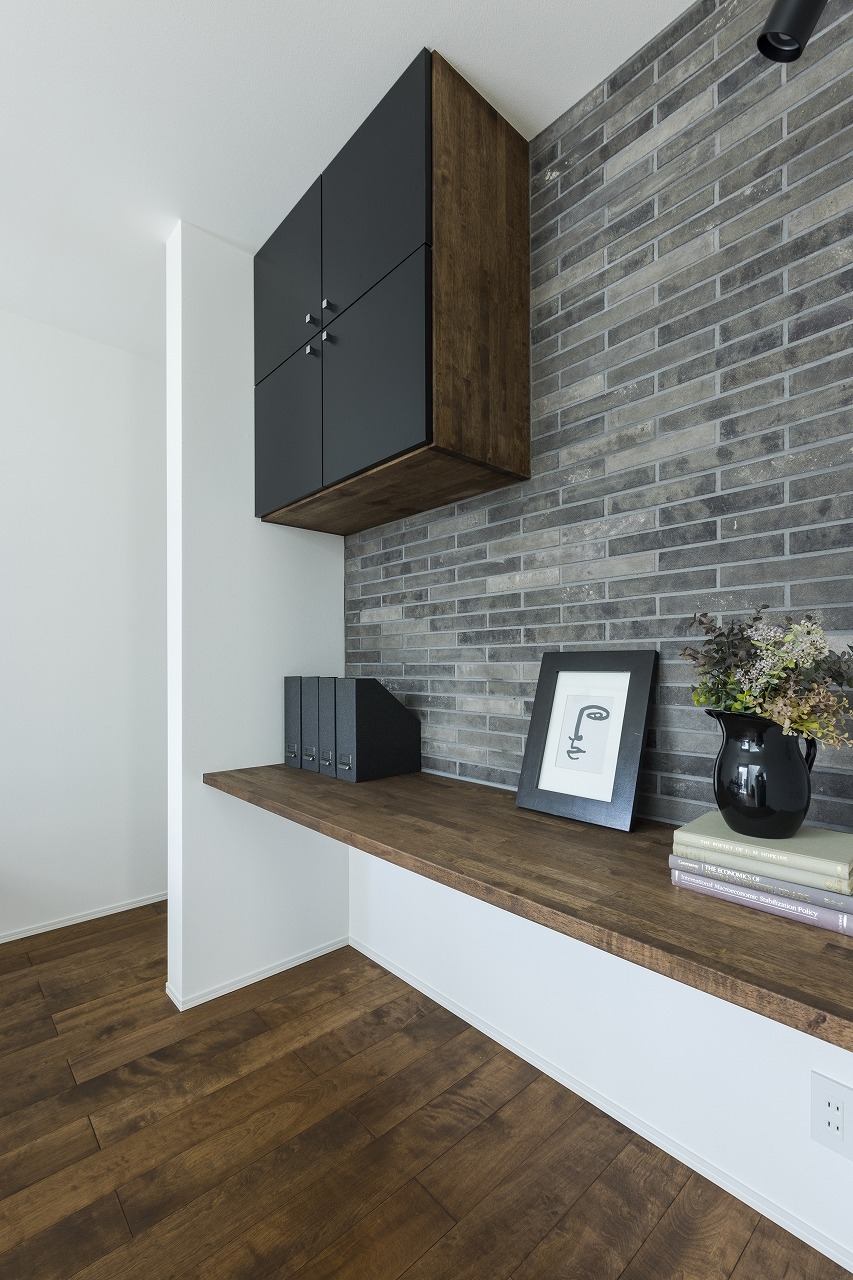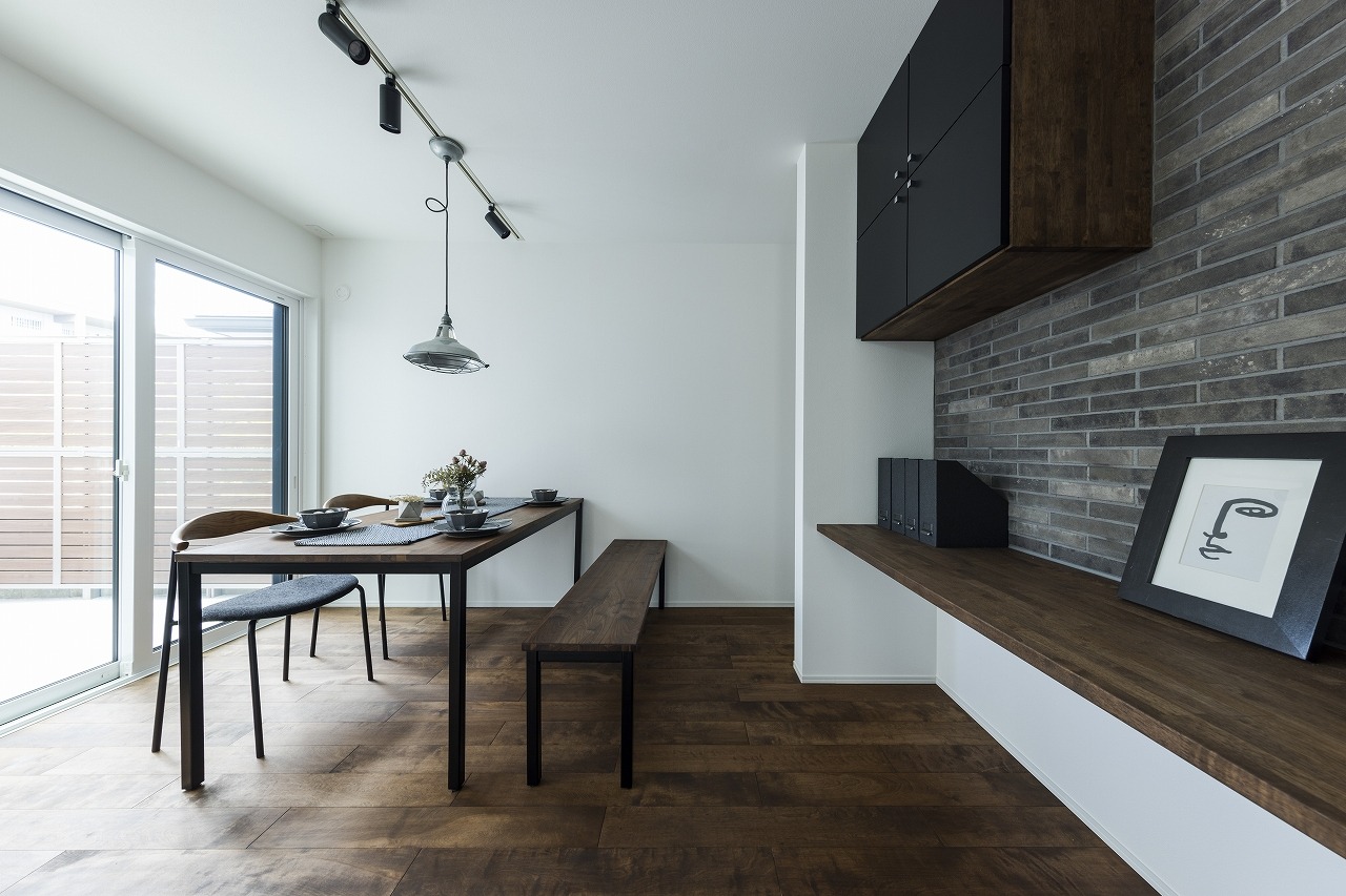 LDKは開放的な吹抜けがあり、4つの窓がアクセントとなったオシャレな空間。キッチンから見える中庭は道路からの目線がシャットアウトされているので、外を見ながら楽しく料理できます。キッチンから洗面、廊下から洗面と家事動線にもこだわっています。洗面には収納を確保し、タオルや下着などを収納可能。また2階寝室にはテレワークスペースとしても使える書斎があります。