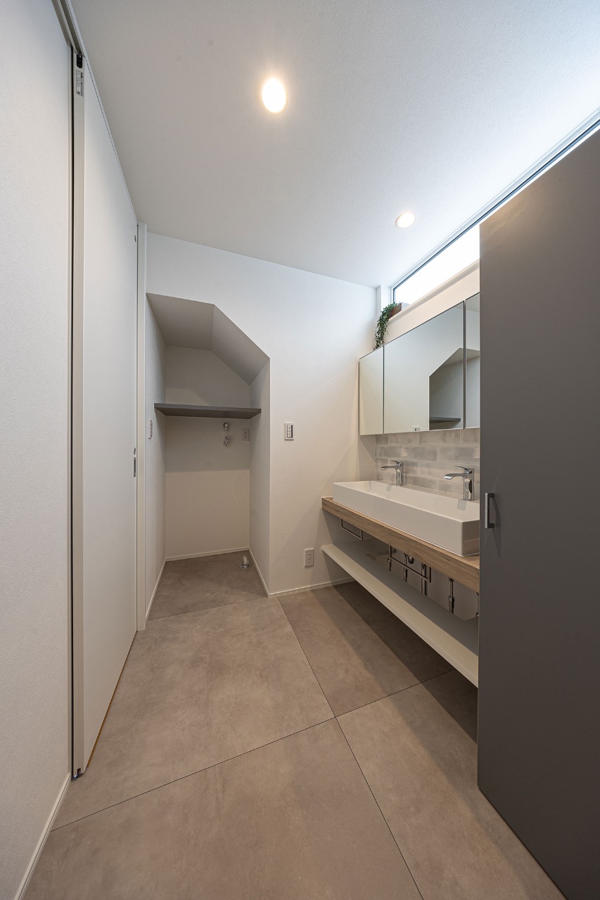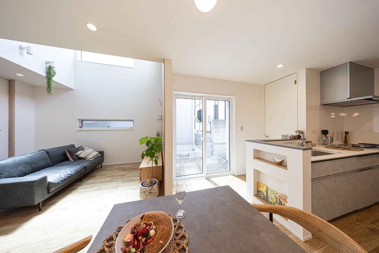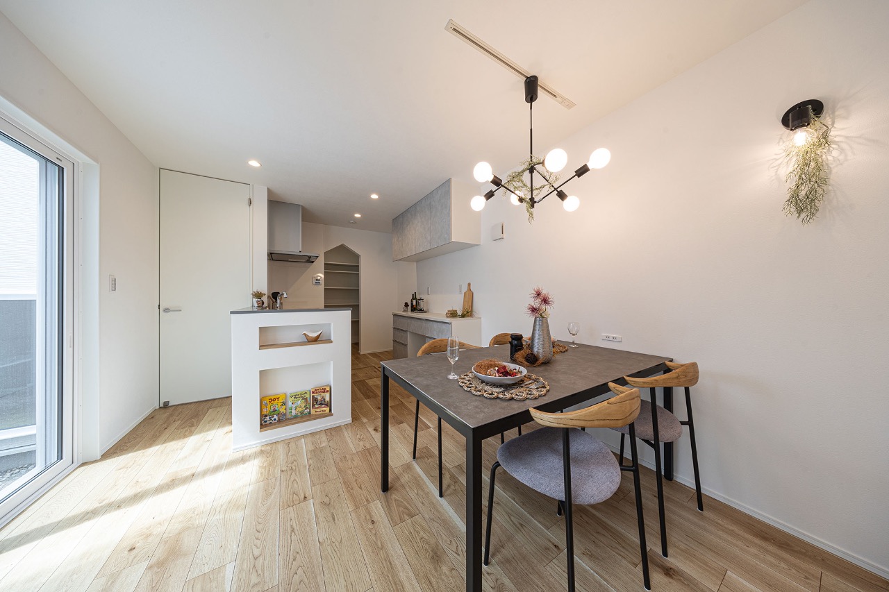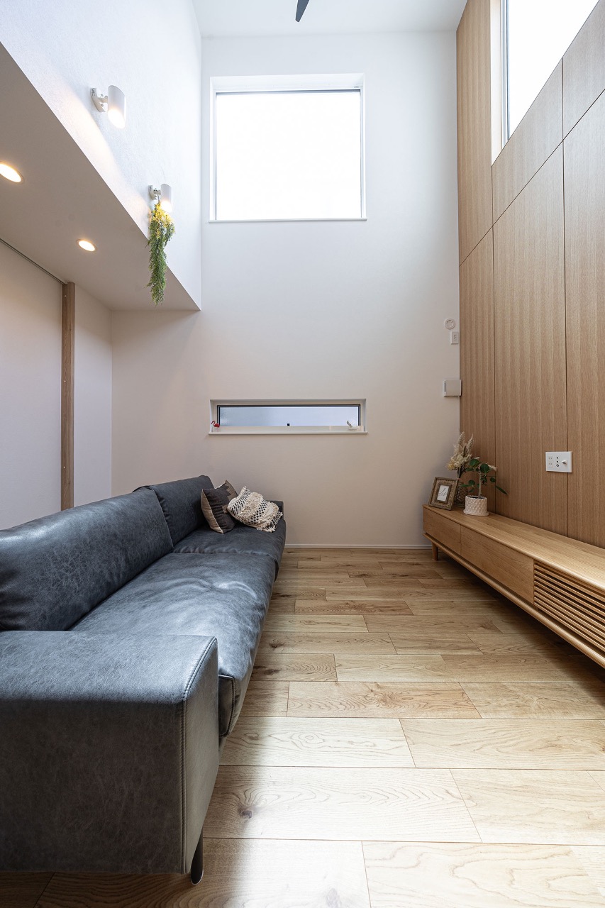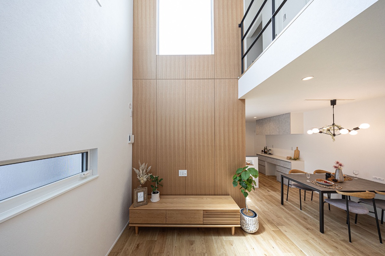 吹き抜けの木製のアクセントウォール。ナチュラルテイストの建具、床材、インテリア。まるで森の中にいるような臨場感を味わえる家。