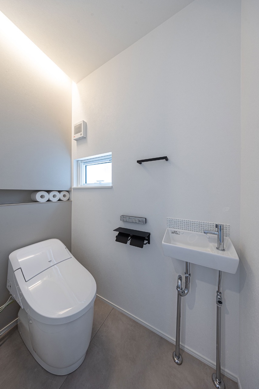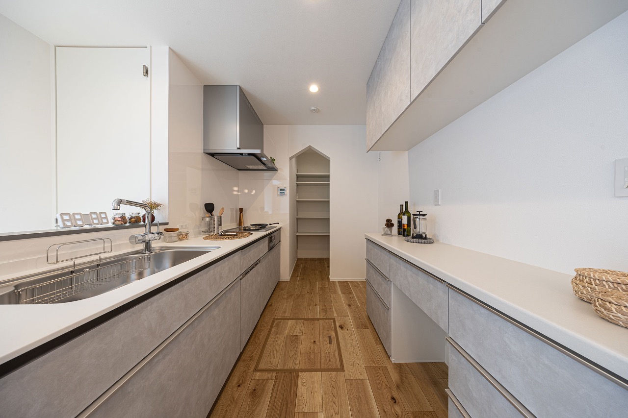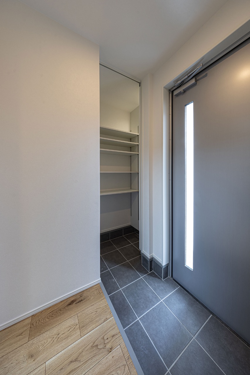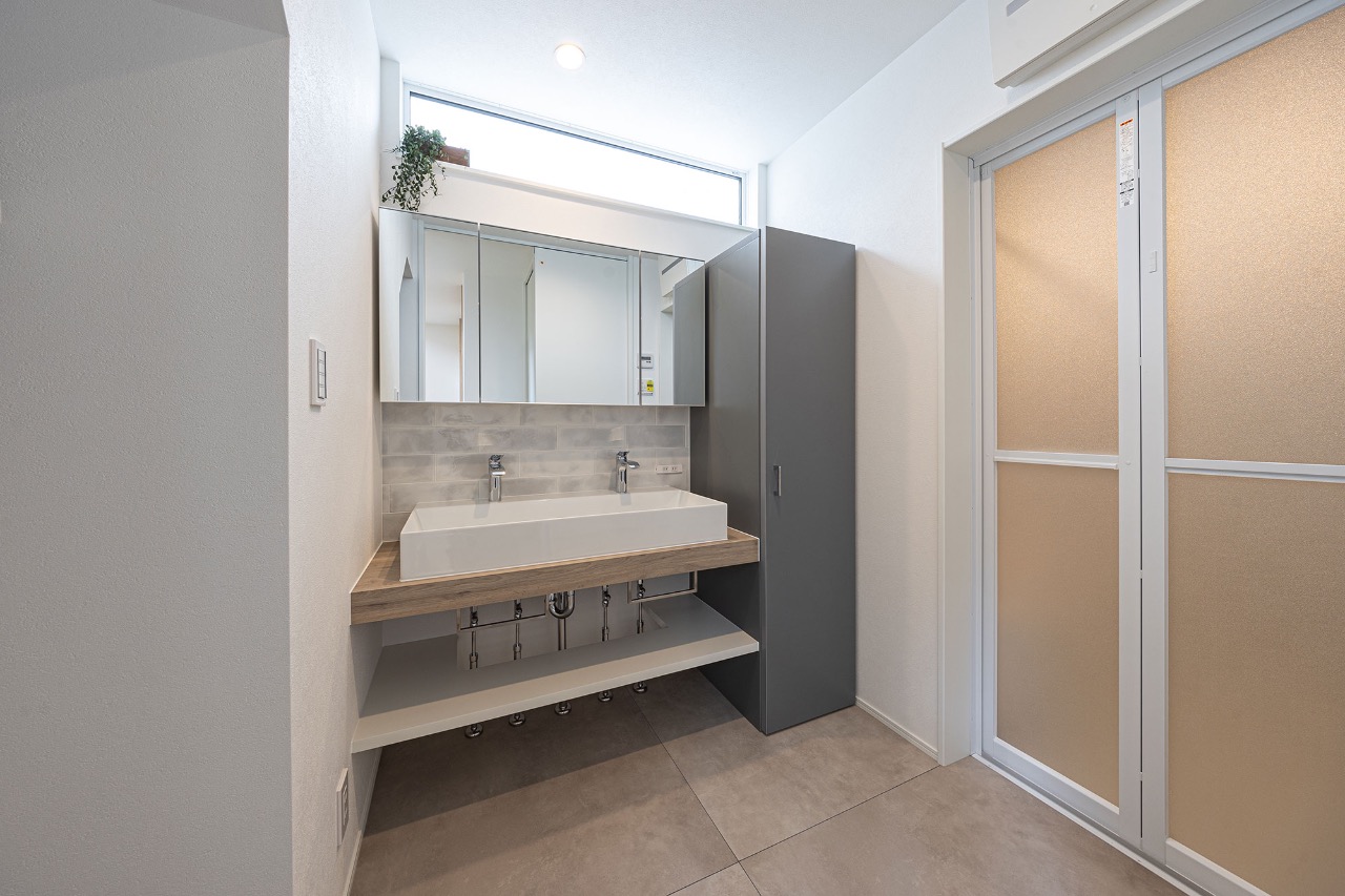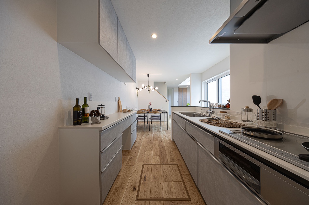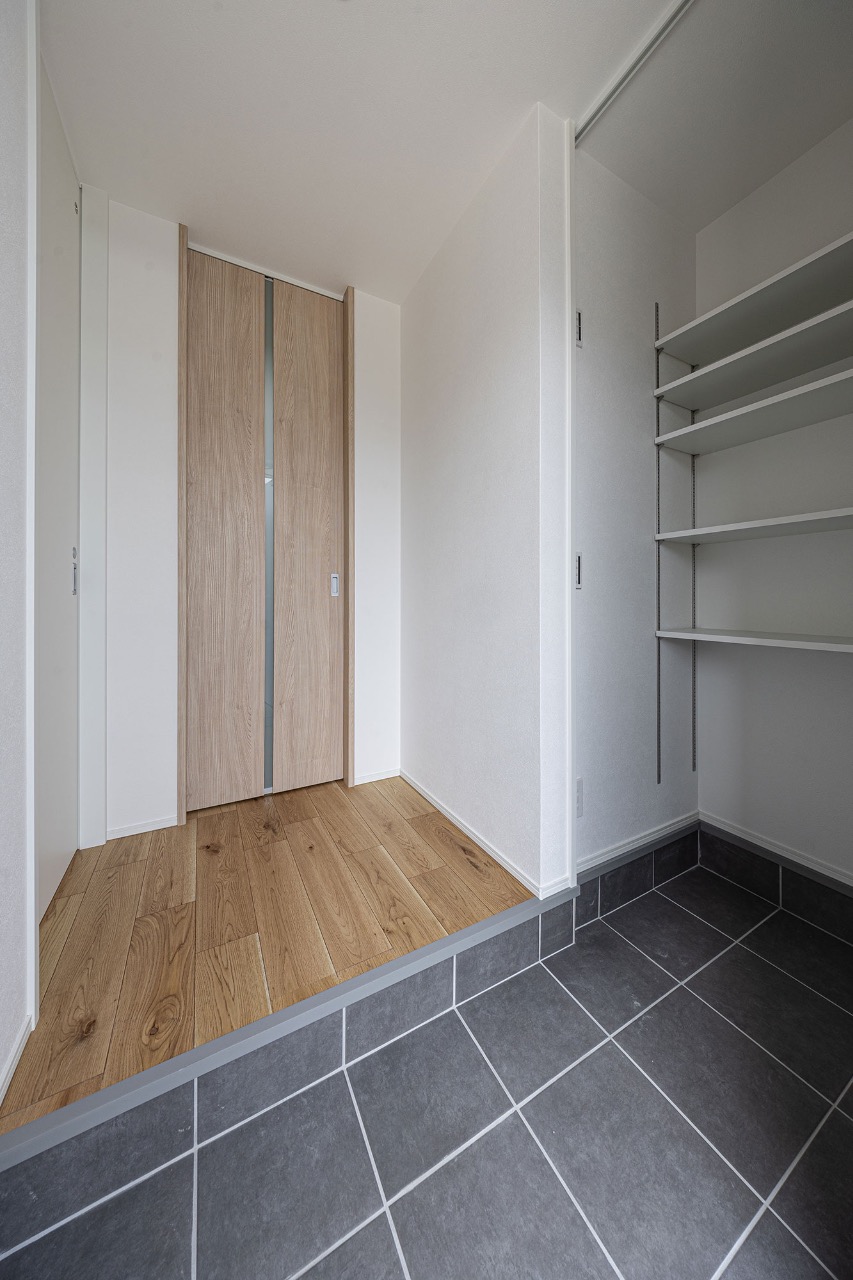 吹き抜けの木製のアクセントウォール。ナチュラルテイストの建具、床材、インテリア。まるで森の中にいるような臨場感を味わえる家。
