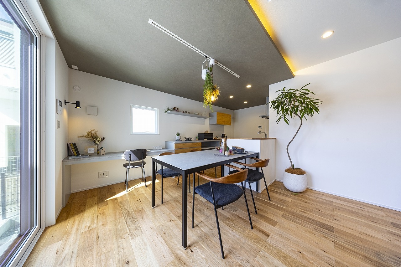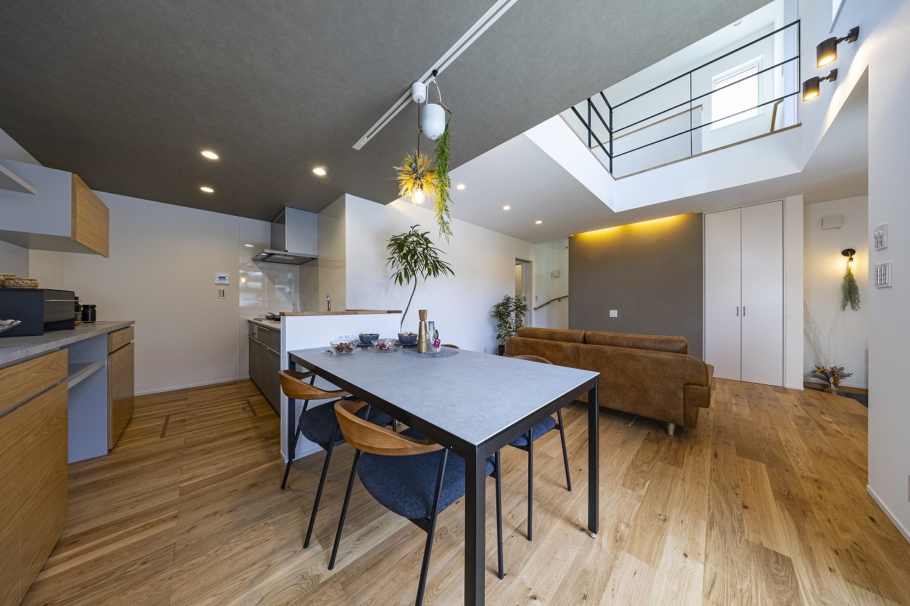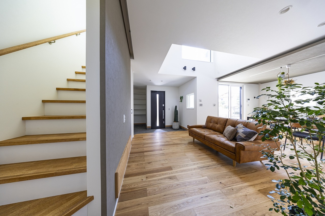 大開口の窓から暖かな光がリビングに差し込み、明るく開放感のある寛ぎの空間に。間接照明が空間を上品に仕上げ、日々の暮らしを豊かにしてくれます。玄関土間とリビングの間にはライフスタイルに応じて仕切りを設置することもでき、玄関をあけた空間を個性的に、多様に活用できます。