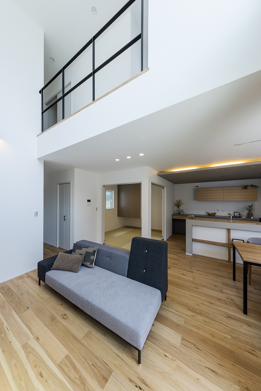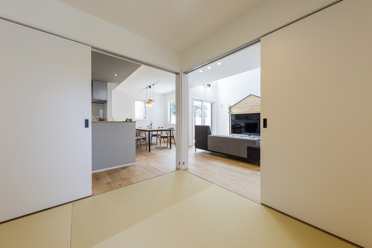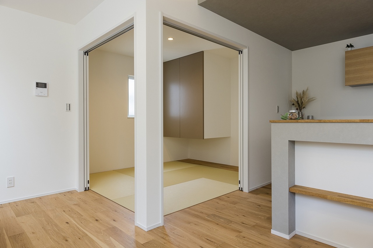 ドアを開けるとそこにあるのは、LDKと和室が繋がり広々とした空間。 繋がりにより開放感ある明るい空間に。 和室は押入れを吊り押入れにし、床として繋がっているため床も広く見える。 繋がりは、広がり。 Connect