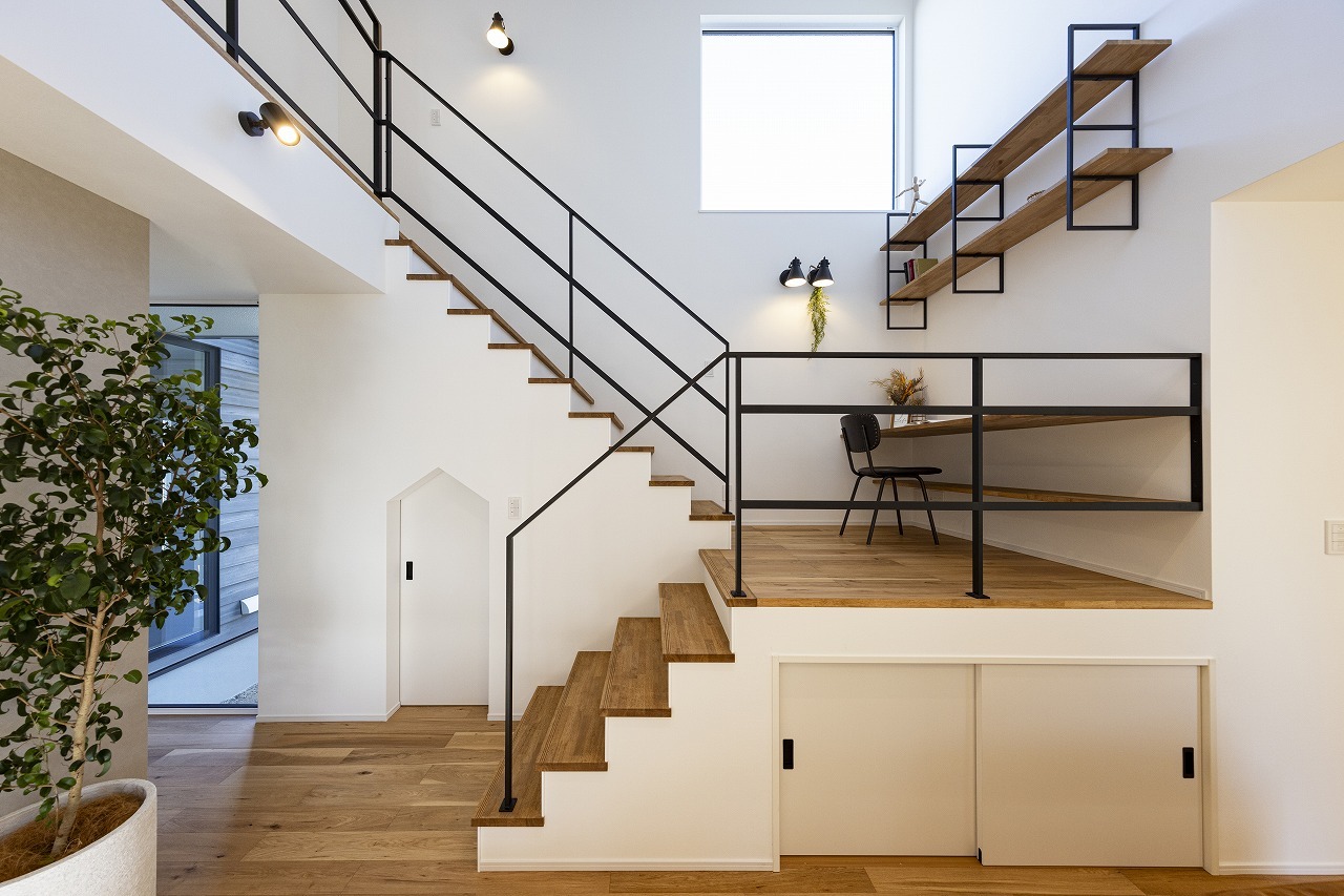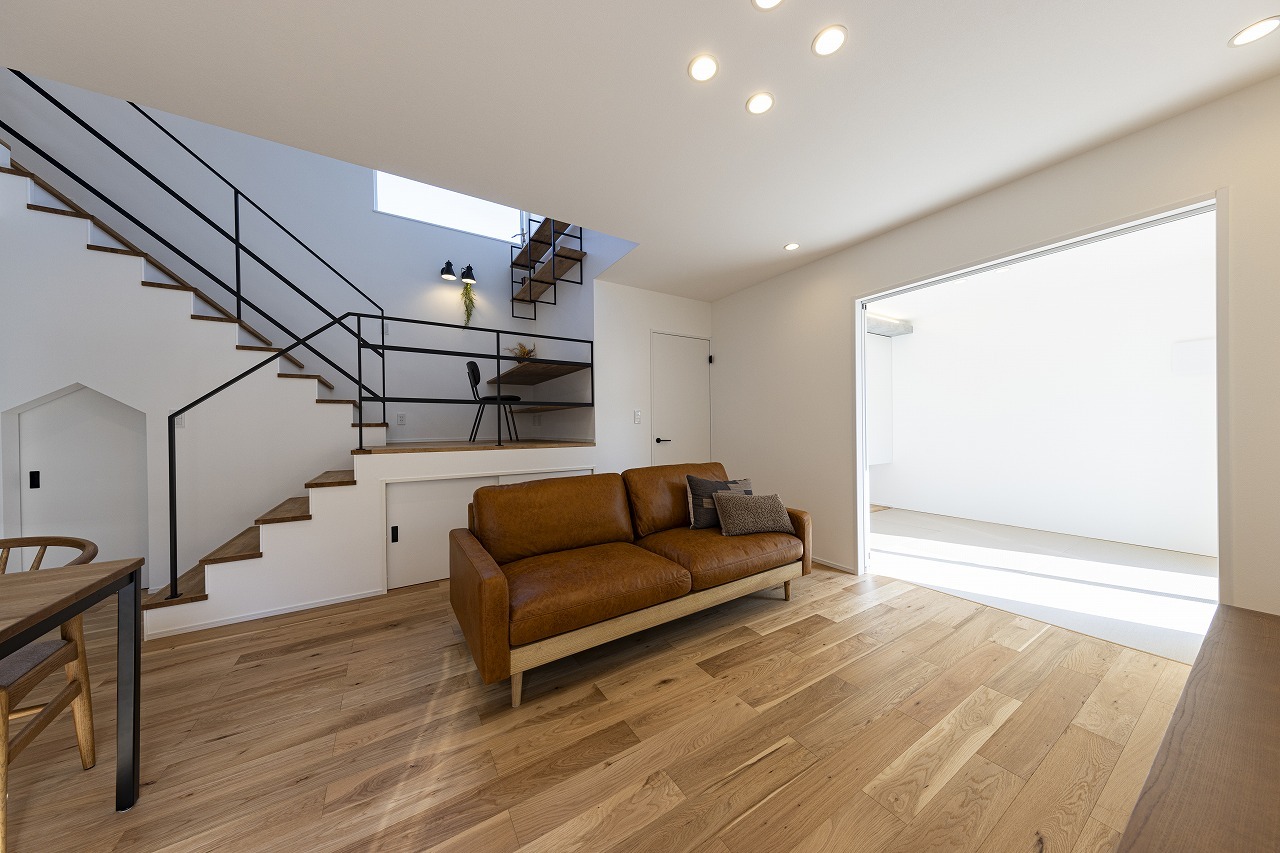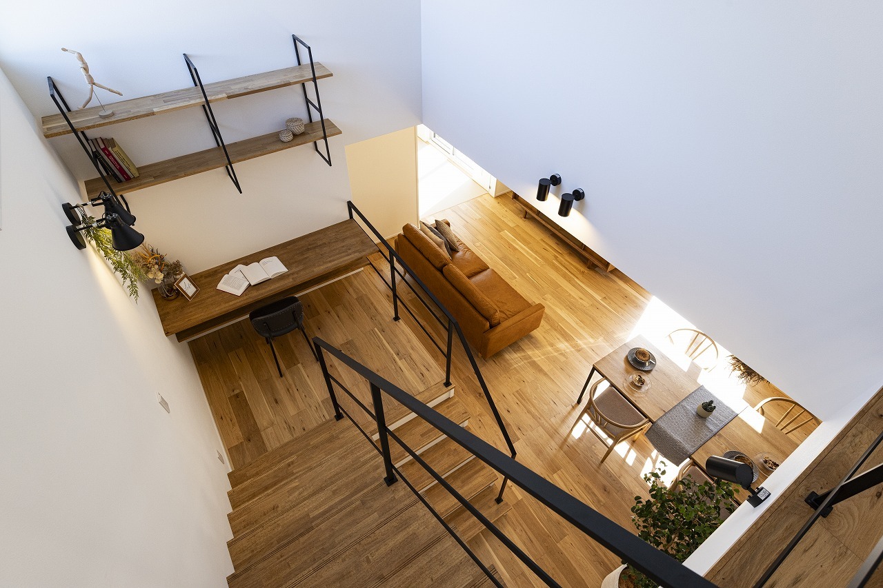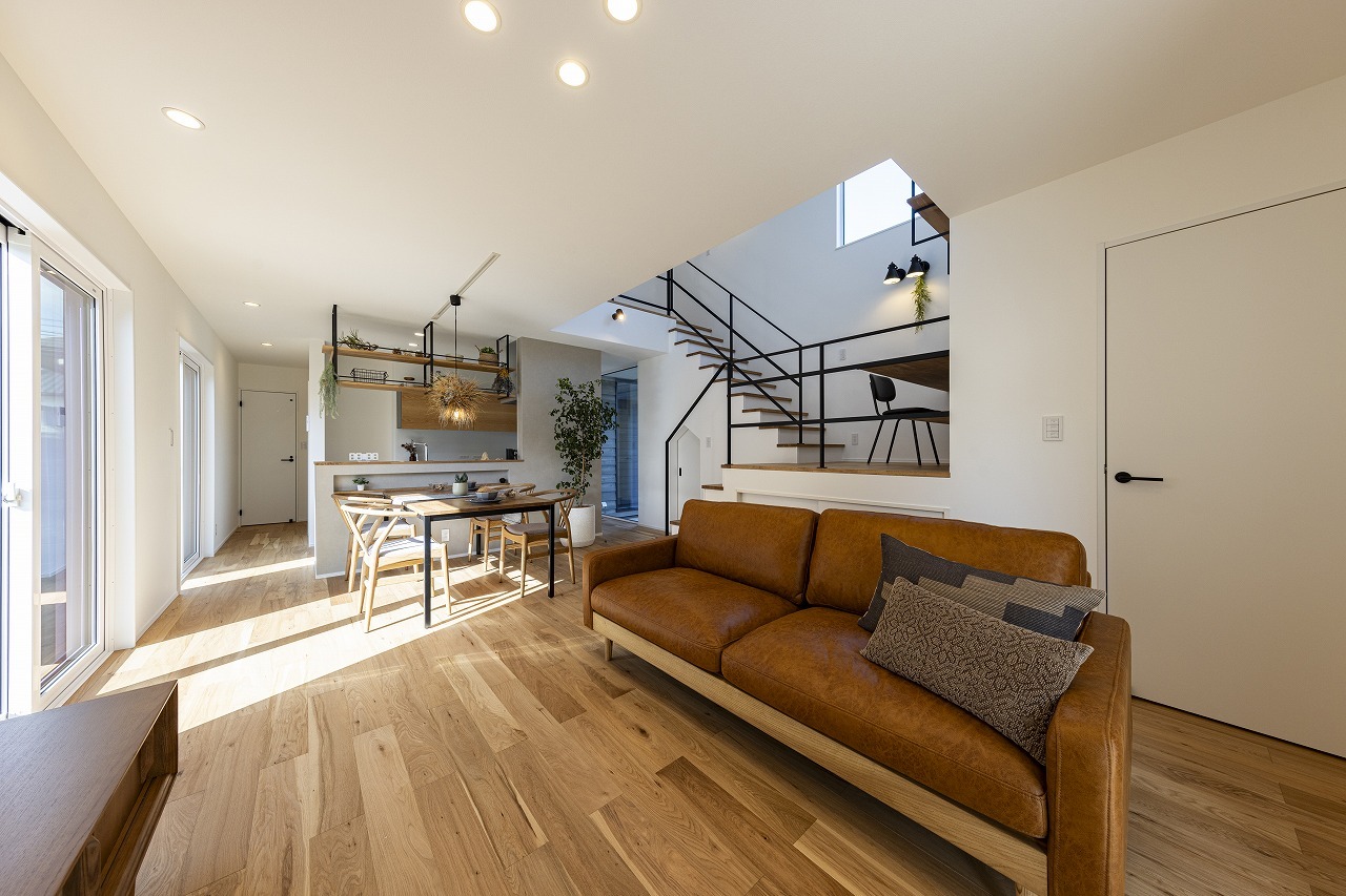 LDK、和室、水廻り、スキップフロアのある階段、2階によって構成される、5 CUBE。スペースを活かしたスキップフロアと吹き抜けで開放感抜群のリビングが特徴的。玄関入ってすぐに玄関ホールとSICを回遊できる導線。さらに玄関ホールからリビングと洗面にそれぞれ繋がり、洗面からキッチン側にも繋がる。水回りの家事も楽になる、回遊性の高い快適な間取りです。