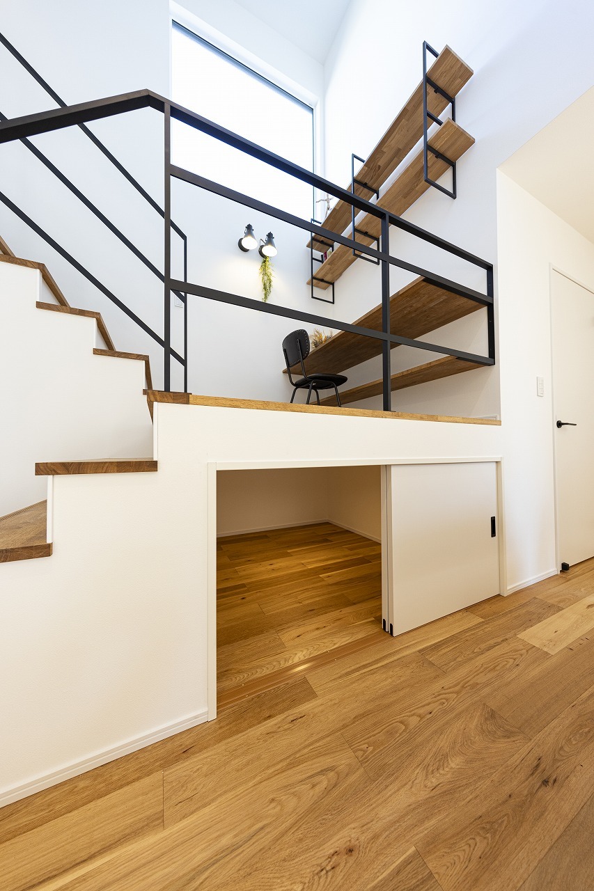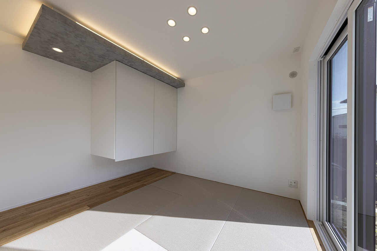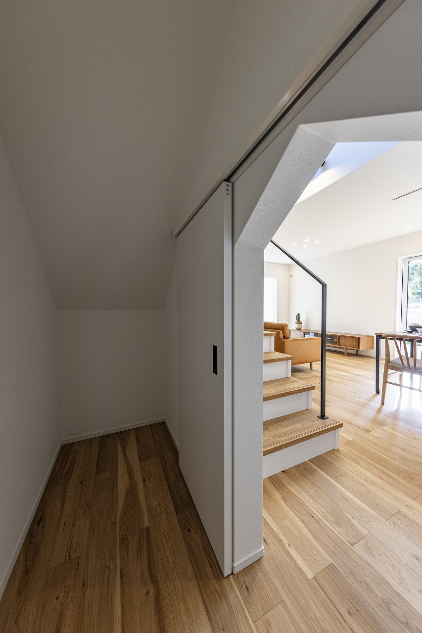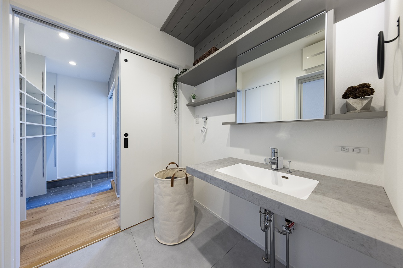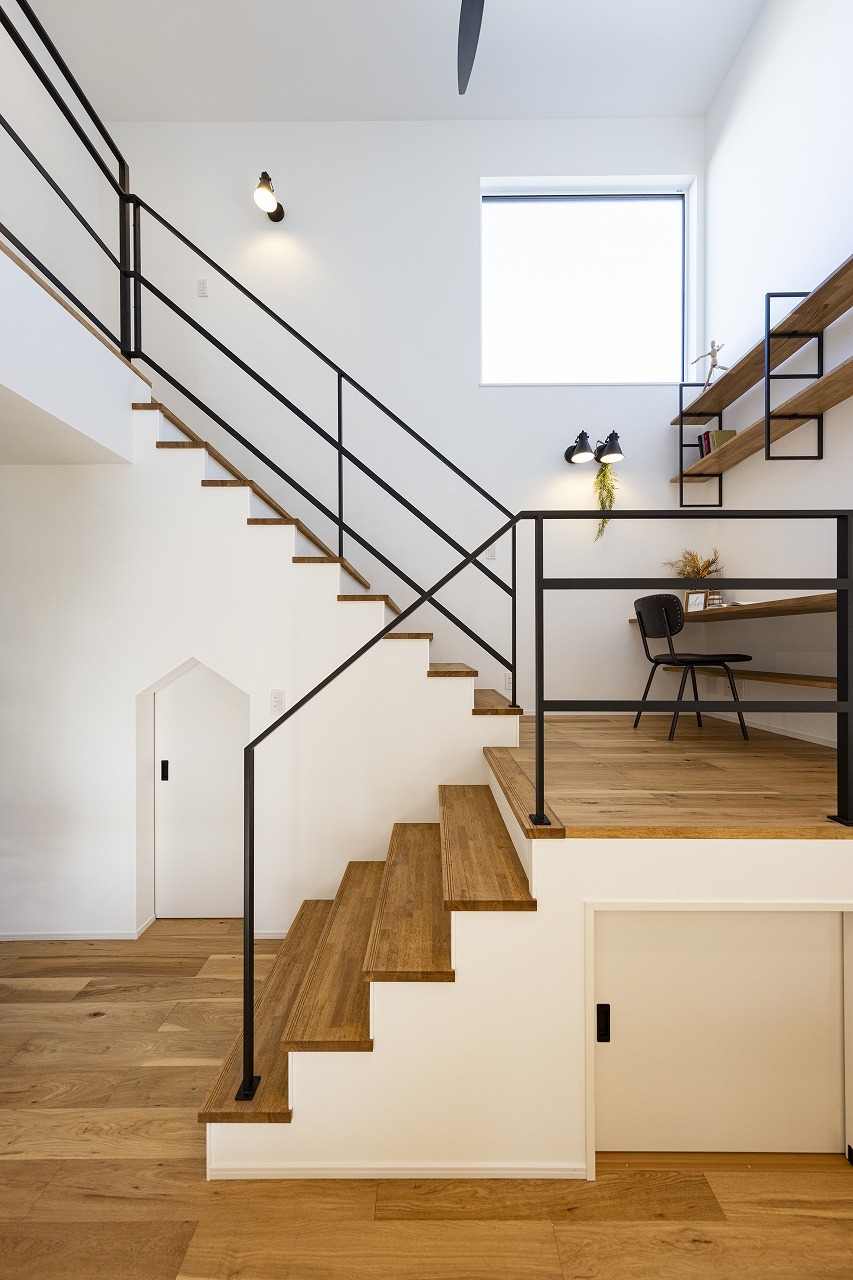 LDK、和室、水廻り、スキップフロアのある階段、2階によって構成される、5 CUBE。スペースを活かしたスキップフロアと吹き抜けで開放感抜群のリビングが特徴的。玄関入ってすぐに玄関ホールとSICを回遊できる導線。さらに玄関ホールからリビングと洗面にそれぞれ繋がり、洗面からキッチン側にも繋がる。水回りの家事も楽になる、回遊性の高い快適な間取りです。