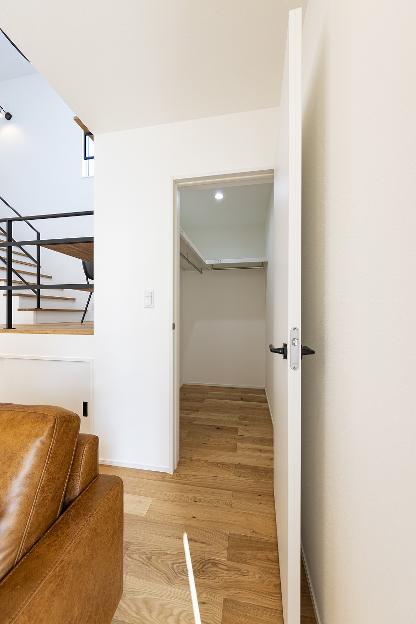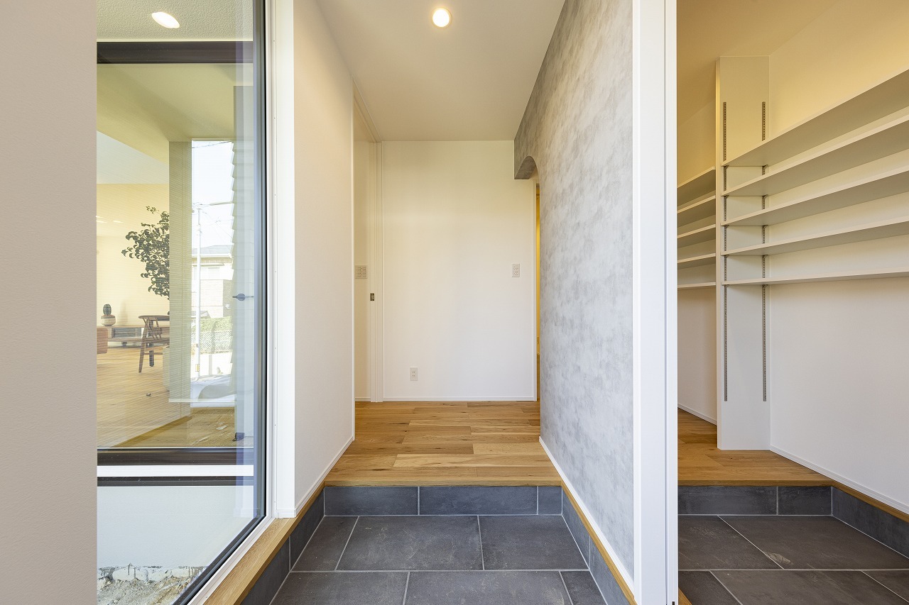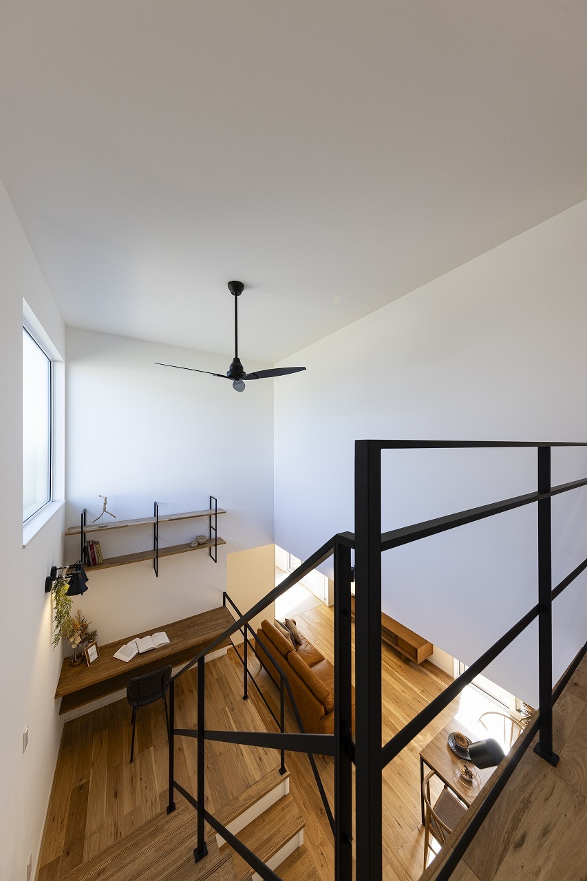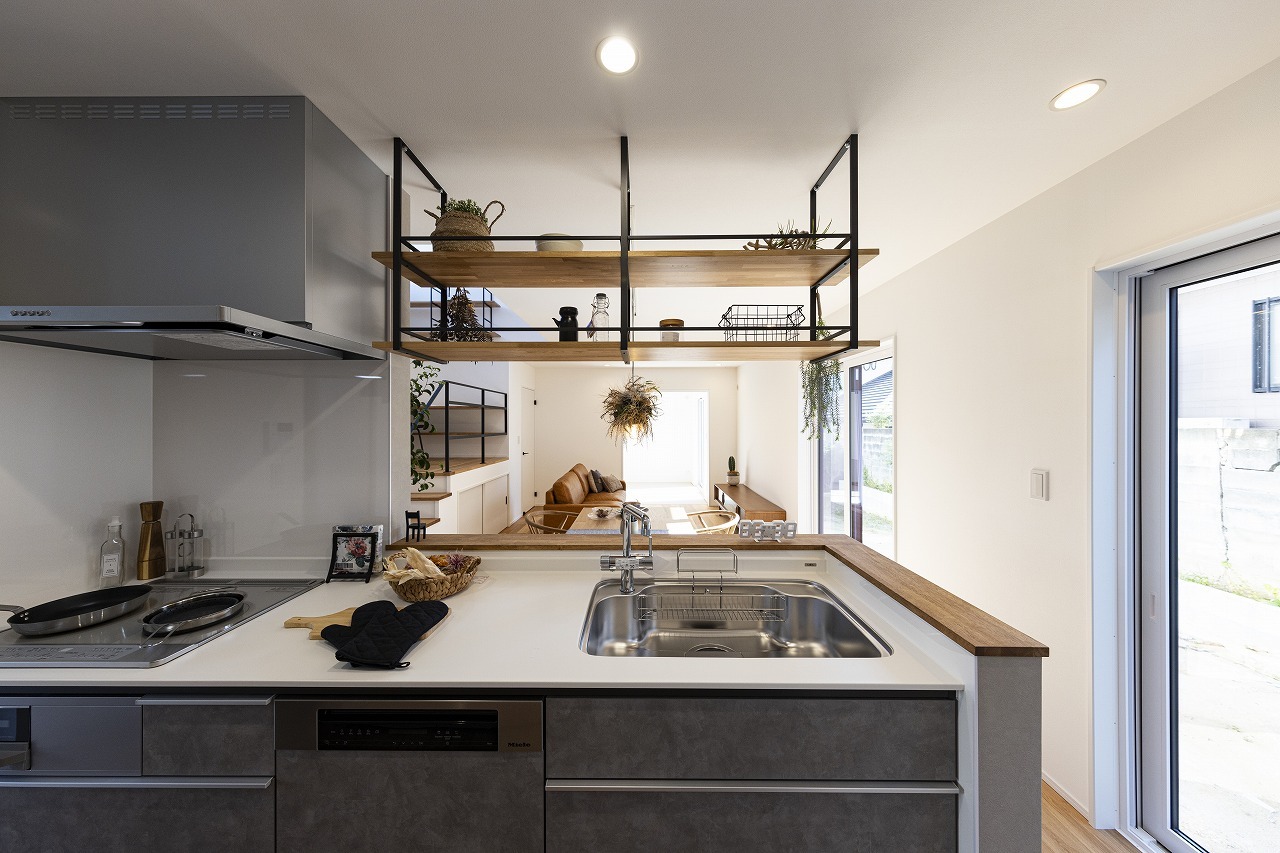 LDK、和室、水廻り、スキップフロアのある階段、2階によって構成される、5 CUBE。スペースを活かしたスキップフロアと吹き抜けで開放感抜群のリビングが特徴的。玄関入ってすぐに玄関ホールとSICを回遊できる導線。さらに玄関ホールからリビングと洗面にそれぞれ繋がり、洗面からキッチン側にも繋がる。水回りの家事も楽になる、回遊性の高い快適な間取りです。