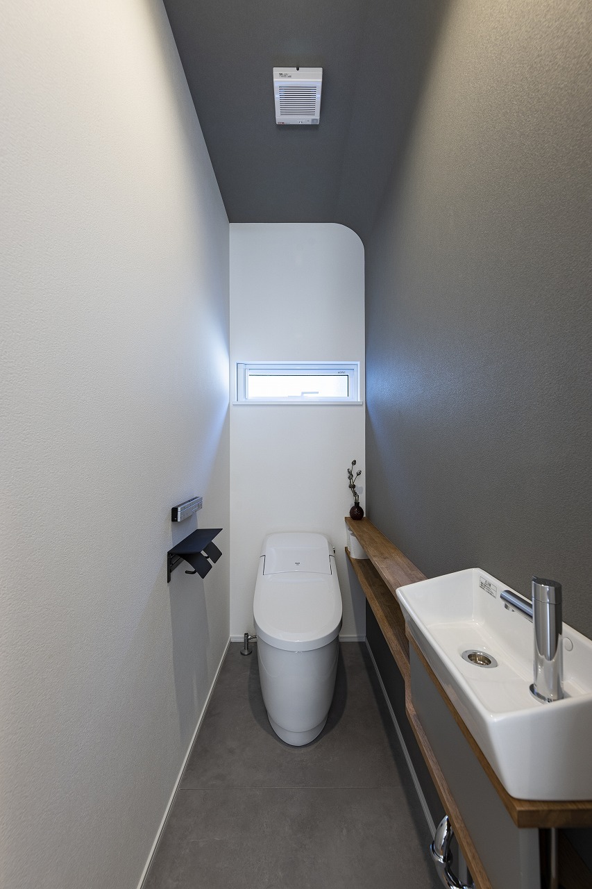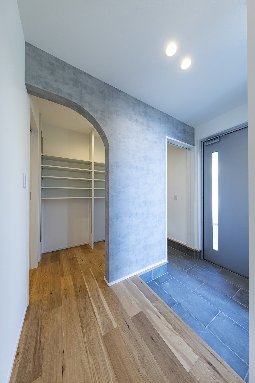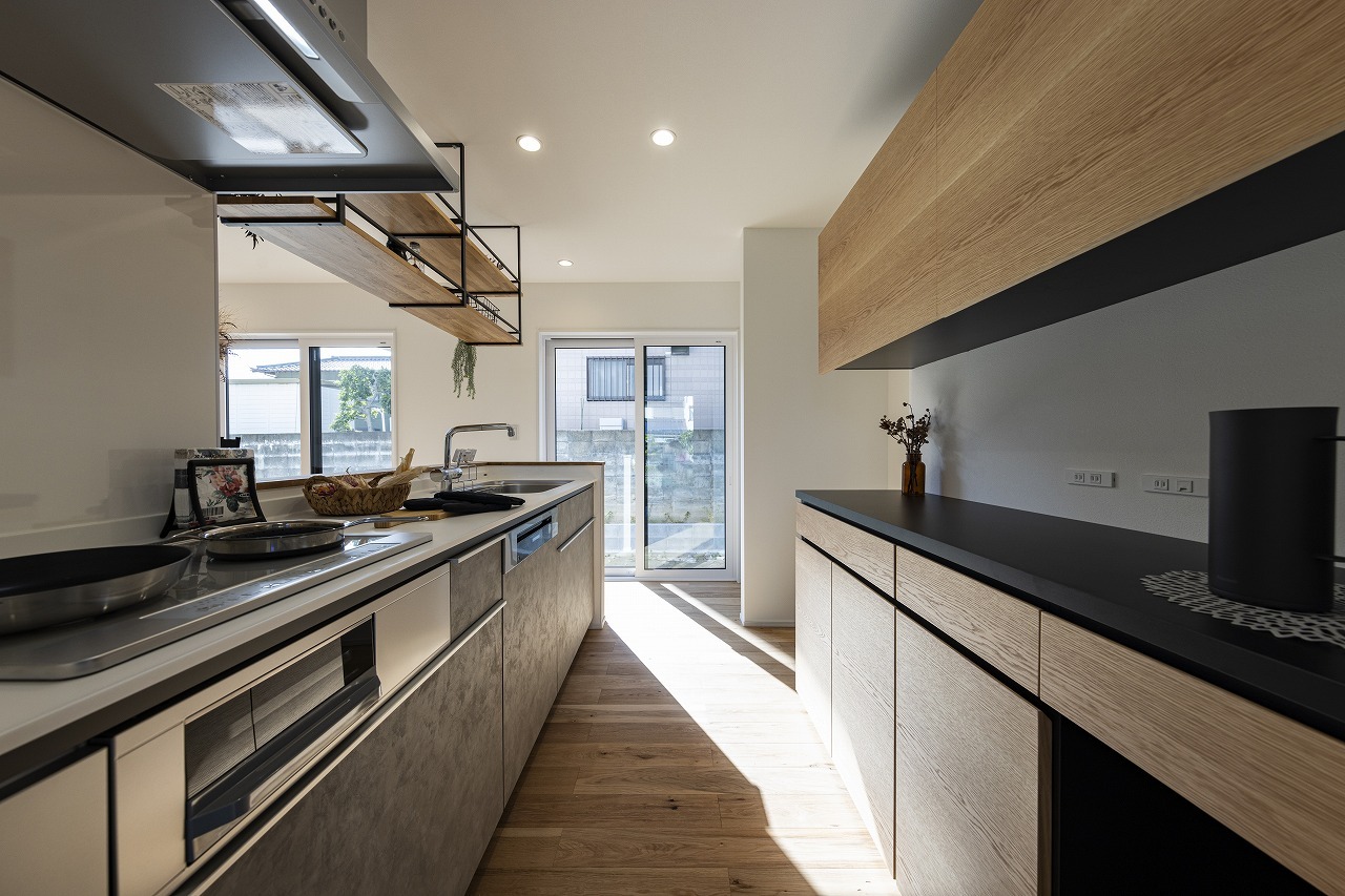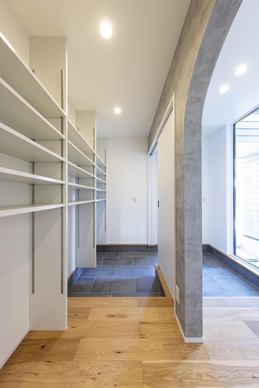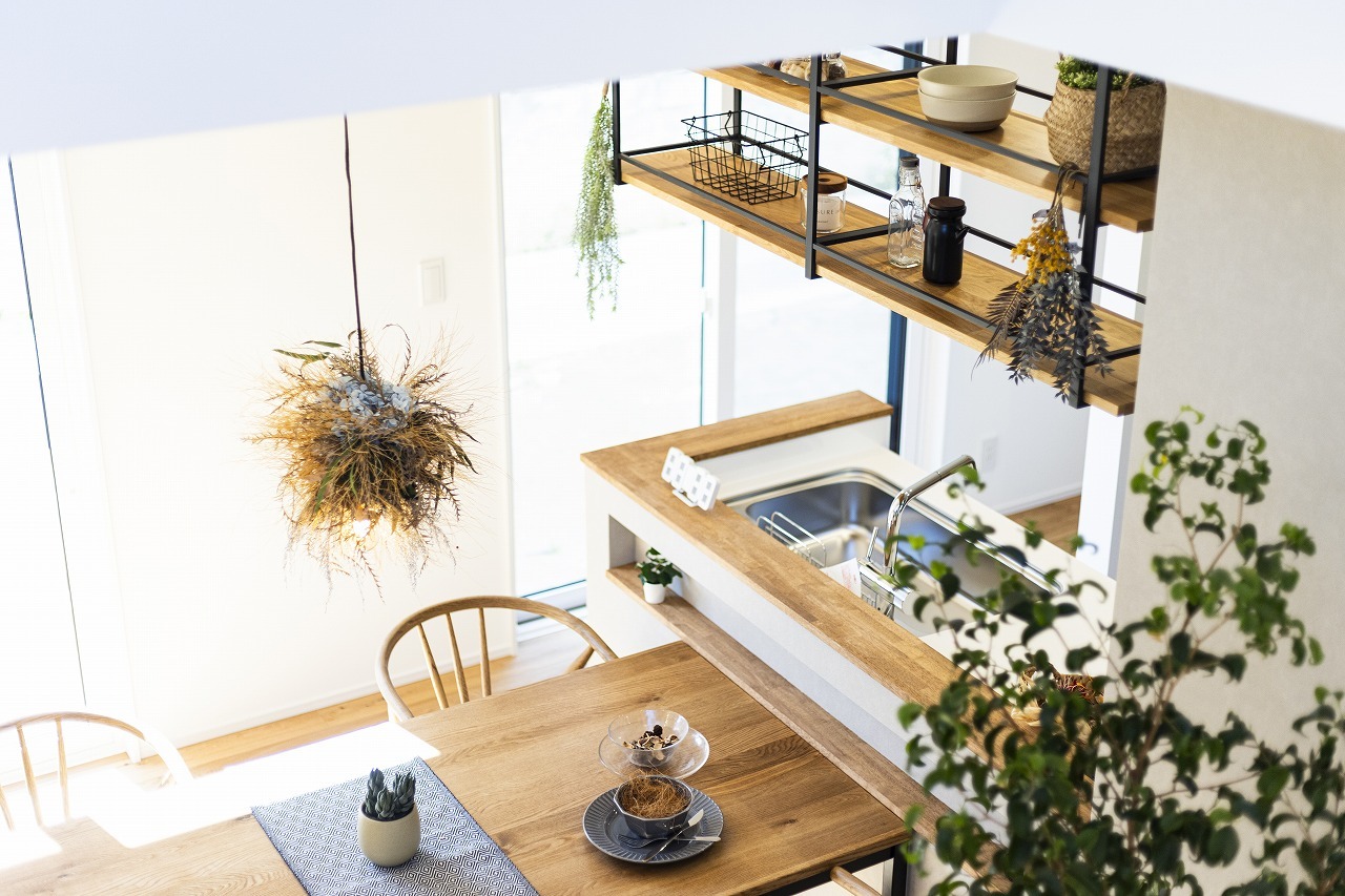 LDK、和室、水廻り、スキップフロアのある階段、2階によって構成される、5 CUBE。スペースを活かしたスキップフロアと吹き抜けで開放感抜群のリビングが特徴的。玄関入ってすぐに玄関ホールとSICを回遊できる導線。さらに玄関ホールからリビングと洗面にそれぞれ繋がり、洗面からキッチン側にも繋がる。水回りの家事も楽になる、回遊性の高い快適な間取りです。