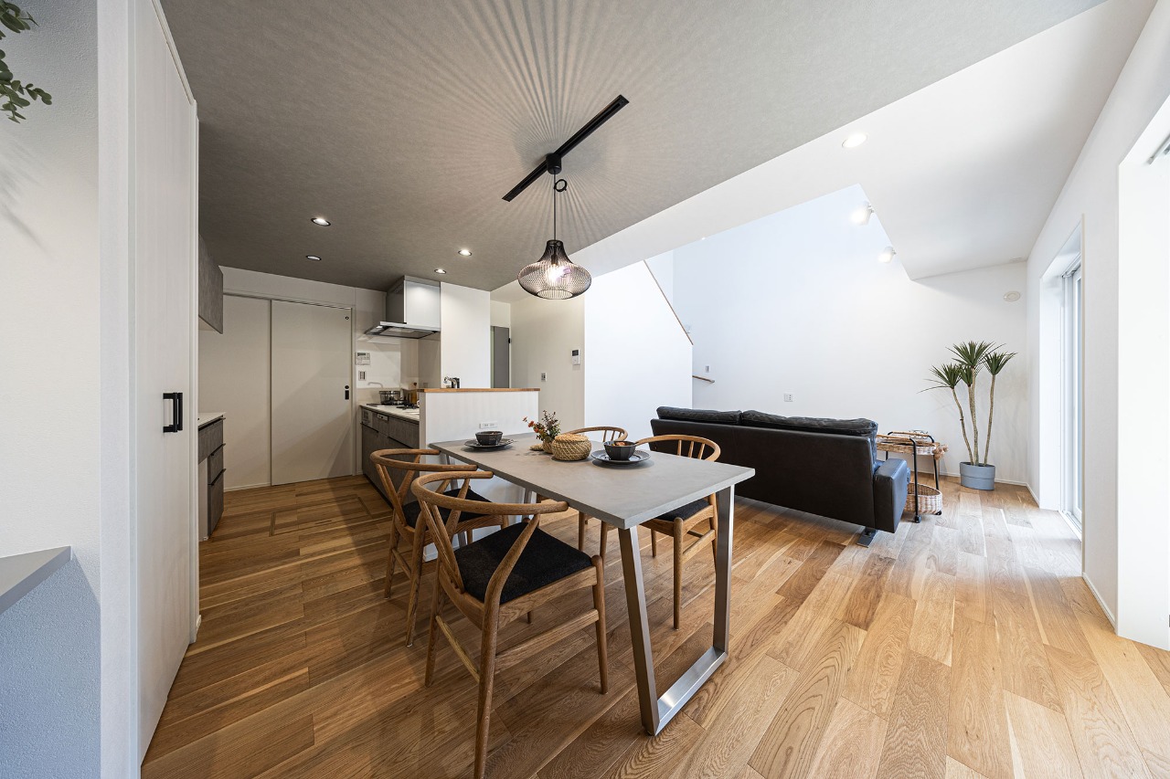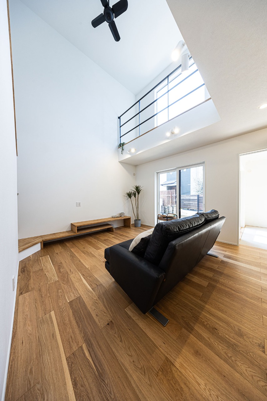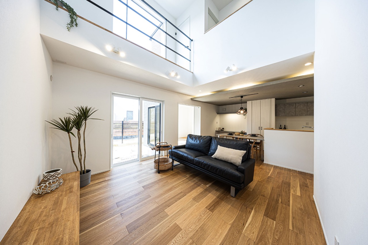LDKには明るい自然光の入る大窓のある吹き抜け。これからの暮らしも楽しくなりそうな、見通しのいい家。