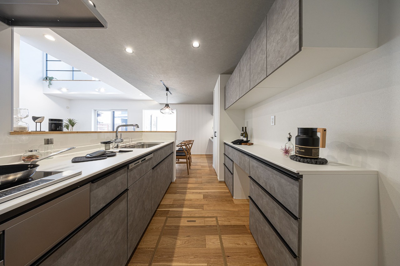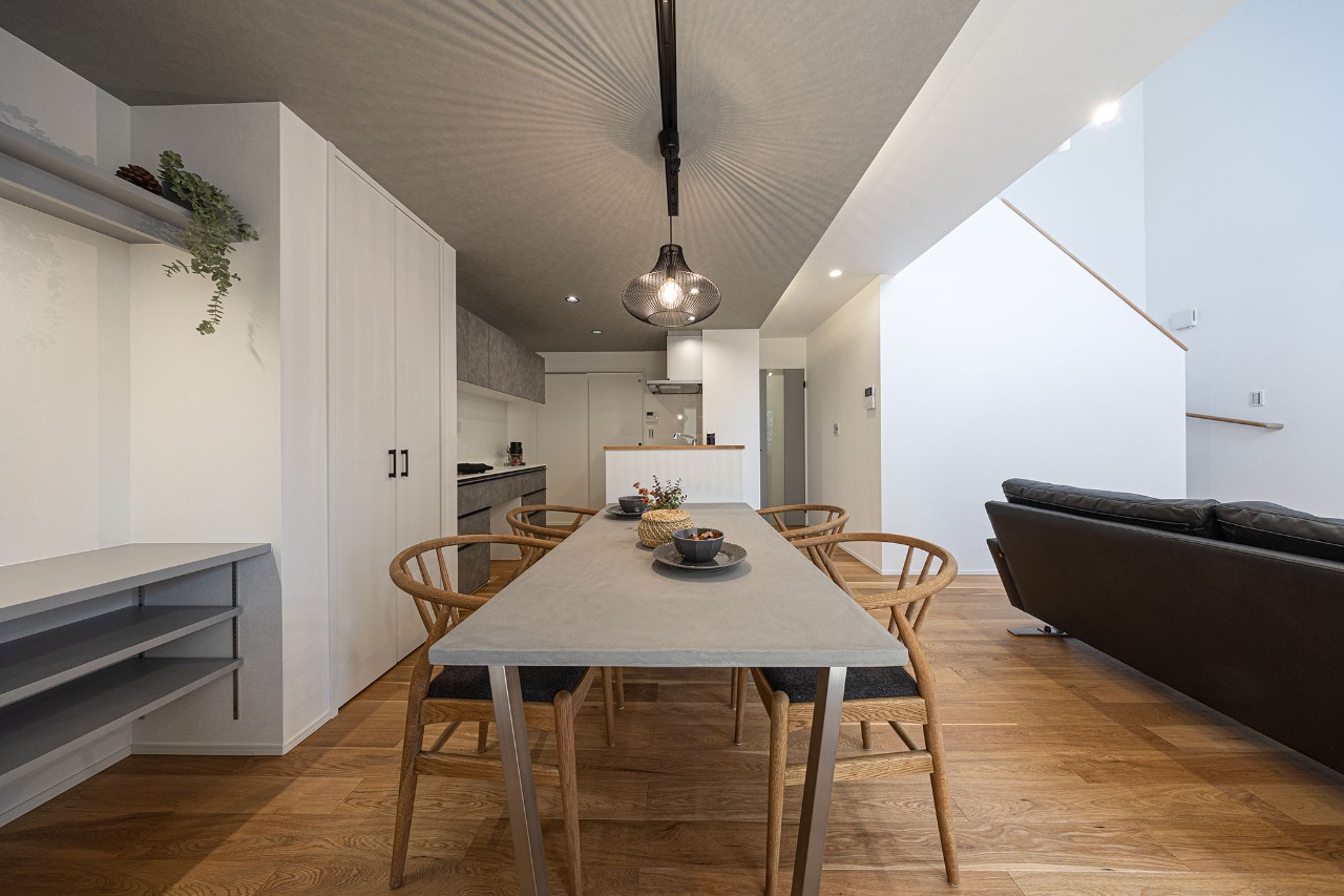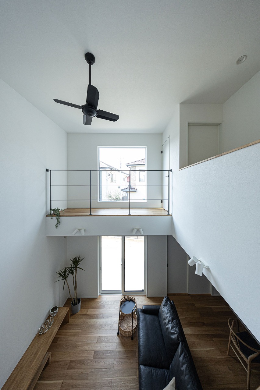 LDKには明るい自然光の入る大窓のある吹き抜け。これからの暮らしも楽しくなりそうな、見通しのいい家。