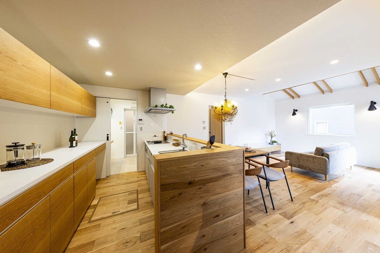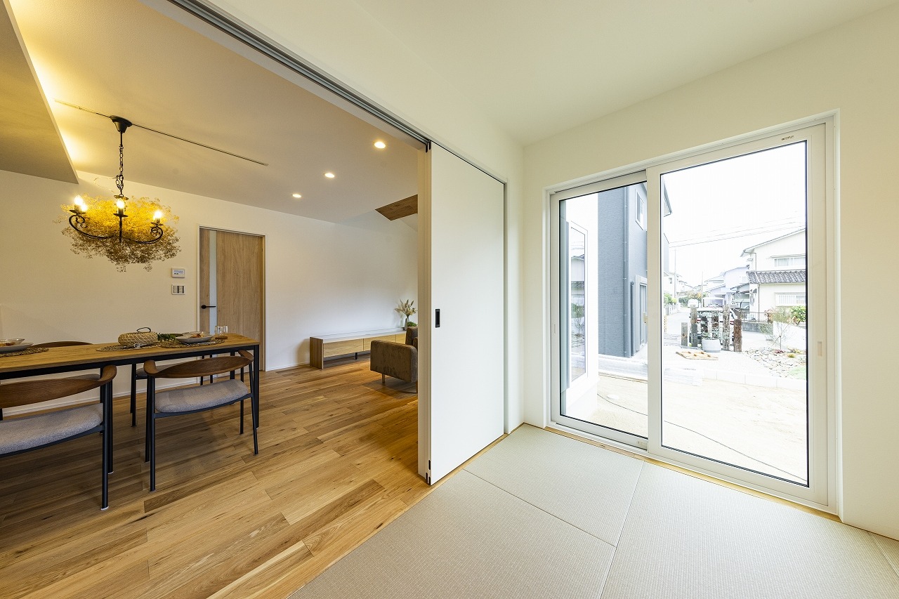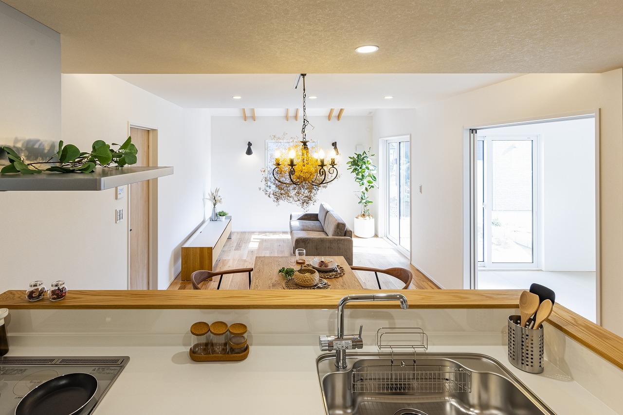ソファ、ダイニングテーブル、ダイニングチェア、テレビボード、食器棚、フラワーシャンデリア付き キッチンから洗面に行けるので、料理や洗濯といった日々の家事がスムーズに 対面式キッチンでコミュニケーションの取りやすい空間になっています 食器棚が付いており、充実のキッチン収納です キッチン横のワークスペースはちょっとした作業に最適です 階段周りは暗くならないように窓を配置 明るく広々としたリビング空間 和室とリビングが繋がることで21.5帖の広々空間に 2階にある服の収納に便利なWIC キッチンから繋がる洗面所。ラクラク家事動線です 洗面所は何かと必要になる収納も完備、スペースも広々です のんびりと寛げる広々浴室スペース 温水洗浄便座付き、1階と2階にトイレがあります 玄関から繋がるSICは自転車を入れたりちょっとした物置にできる便利スペース 充実の収納空間 白い外観に木目調のおしゃれな組み合わせ 快適な暮らしを実現する標準仕様